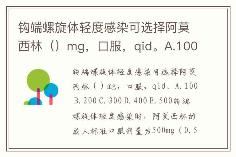 钩端螺旋体轻度感染可选择阿莫西林()mg,口服,qid。A.100 B.200 C.300 D.400 E.500