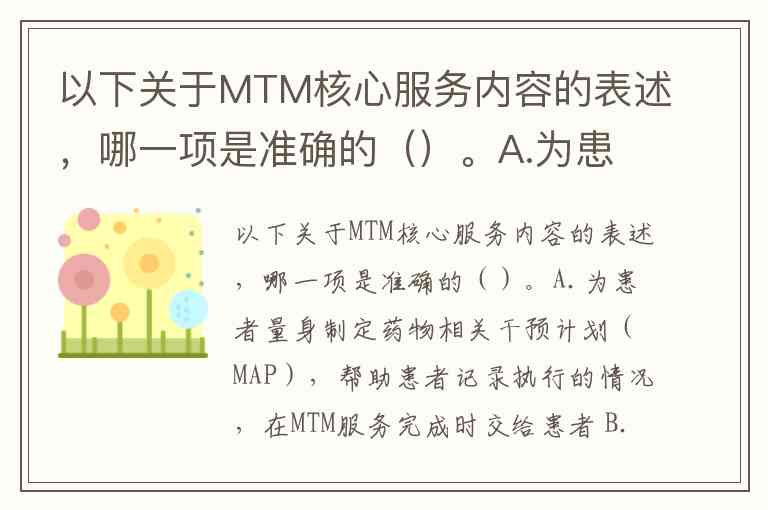 以下关于MTM核心服务内容的表述,哪一项是准确的()。A.为患者量身制定药物相关干预计划(MAP),帮助患者记录执行的情况,在MTM服务完成时交给患者 B.要求药师把SOAPnote交给患者,以便患者了解药师提供的相关建议 C.要求药房技术员仅做与发药相关的工作,这样可以让药师有更多的时间为患者提供MTM合作 D.为了让更多的患者享受到MTM服务,应该为患者提供免费的MTM服务