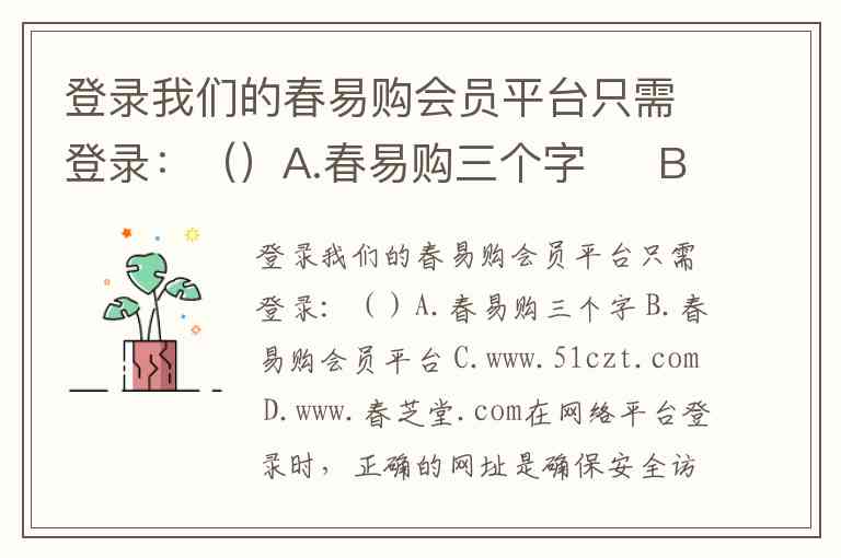 登录我们的春易购会员平台只需登录:()A.春易购三个字 B.春易购会员平台 C.www.51czt.com D.www.春芝堂.com