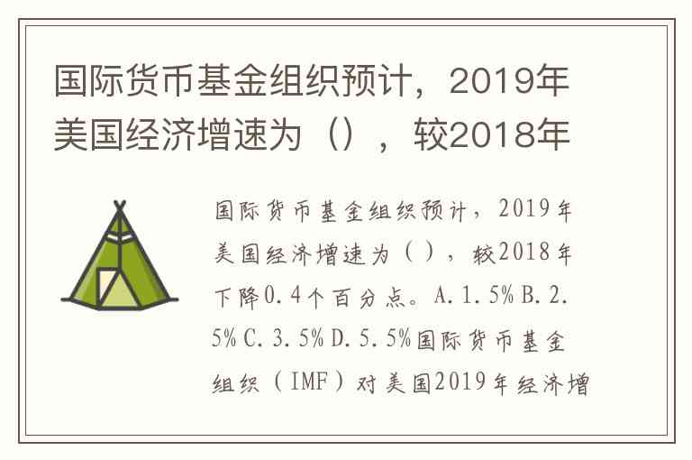 国际货币基金组织预计,2019年美国经济增速为(),较2018年下降0.4个百分点。A.1.5% B.2.5% C.3.5% D.5.5%