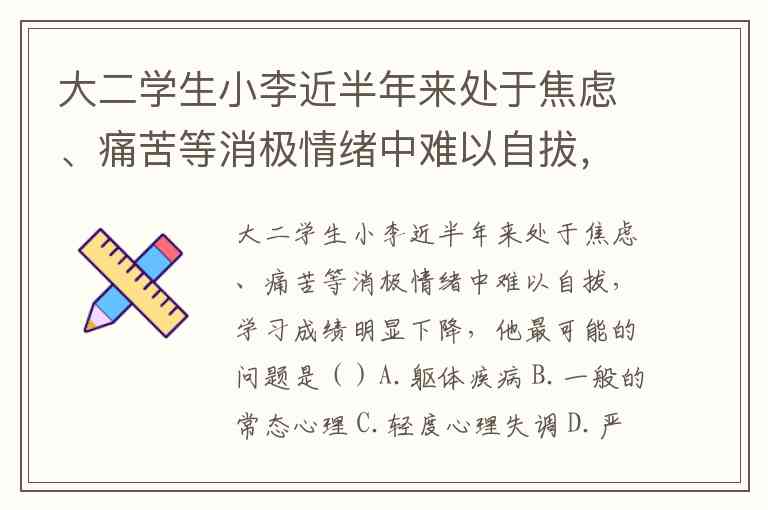 大二学生小李近半年来处于焦虑、痛苦等消极情绪中难以自拔,学习成绩明显下降,他最可能的问题是()A.躯体疾病 B.一般的常态心理 C.轻度心理失调 D.严重病态心理