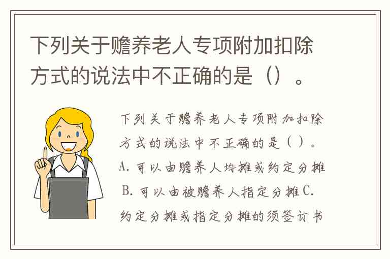 下列关于赡养老人专项附加扣除方式的说法中不正确的是()。A.可以由赡养人均摊或约定分摊 B.可以由被赡养人指定分摊 C.约定分摊或指定分摊的须签订书面分摊协议 D.约定分摊优于指定分摊