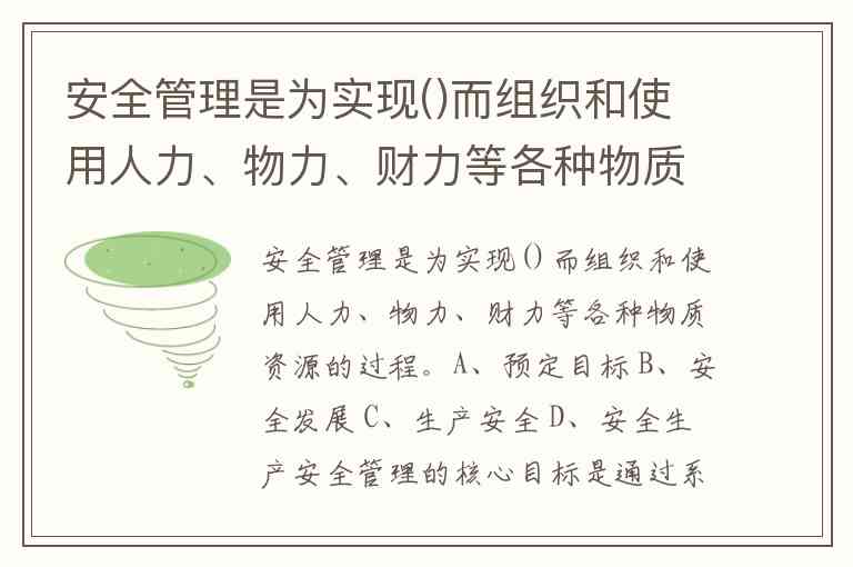 安全管理是为实现()而组织和使用人力、物力、财力等各种物质资源的过程。A、预定目标 B、安全发展 C、生产安全 D、安全生产