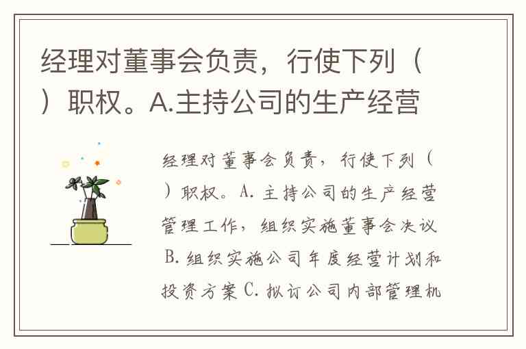 经理对董事会负责,行使下列()职权。A.主持公司的生产经营管理工作,组织实施董事会决议 B.组织实施公司年度经营计划和投资方案 C.拟订公司内部管理机构设置方案 D.制订公司合并、分立、变更公司形式、解散的方案