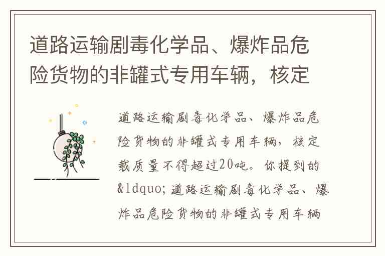 道路运输剧毒化学品、爆炸品危险货物的非罐式专用车辆,核定载质量不得超过20吨。