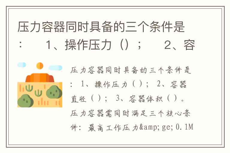压力容器同时具备的三个条件是: 1、操作压力(); 2、容器直径(); 3、容器体积()。