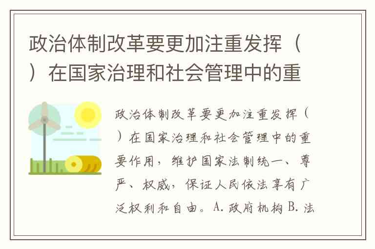 政治体制改革要更加注重发挥()在国家治理和社会管理中的重要作用,维护国家法制统一、尊严、权威,保证人民依法享有广泛权利和自由。A.政府机构 B.法治 C.思想统一