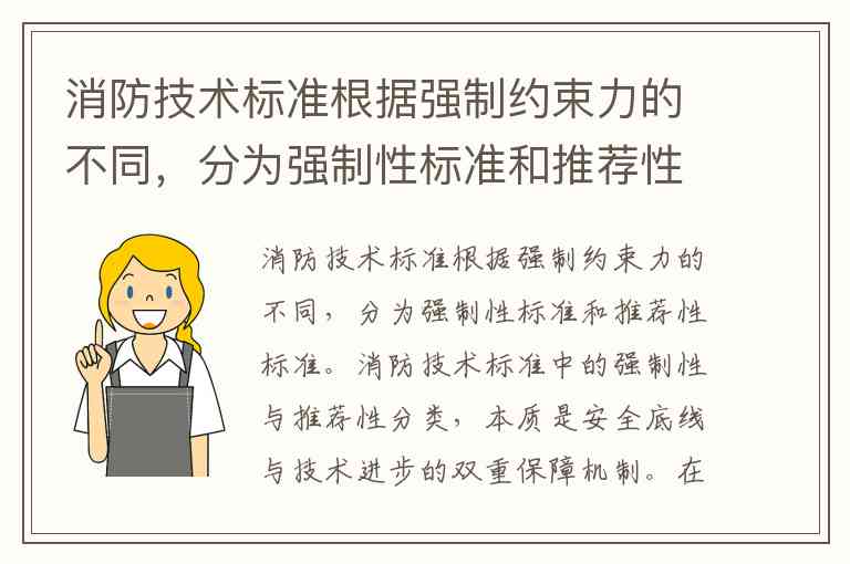 消防技术标准根据强制约束力的不同,分为强制性标准和推荐性标准。