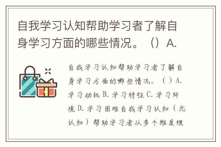 自我学习认知帮助学习者了解自身学习方面的哪些情况。()A.学习动机 B.学习特征 C.学习环境 D.学习困难