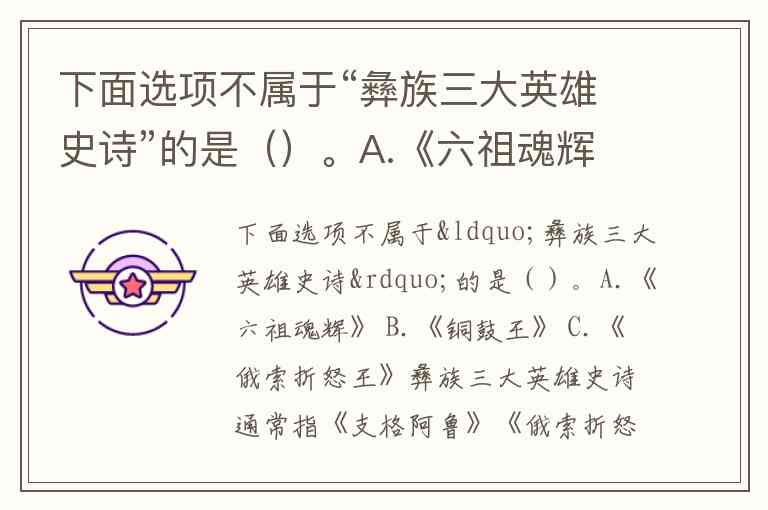 因此,选项A.《六祖魂辉》 不属于彝族三大英雄史诗。理解这一分类的关键在于区分“英雄史诗”以个体英雄事迹为核心的叙事特征,与“创世史诗”侧重民族起源、自然演化的文化内涵。这一划分不仅反映了彝族文学的丰富性,也体现了其对历史记忆的多元表达方式。