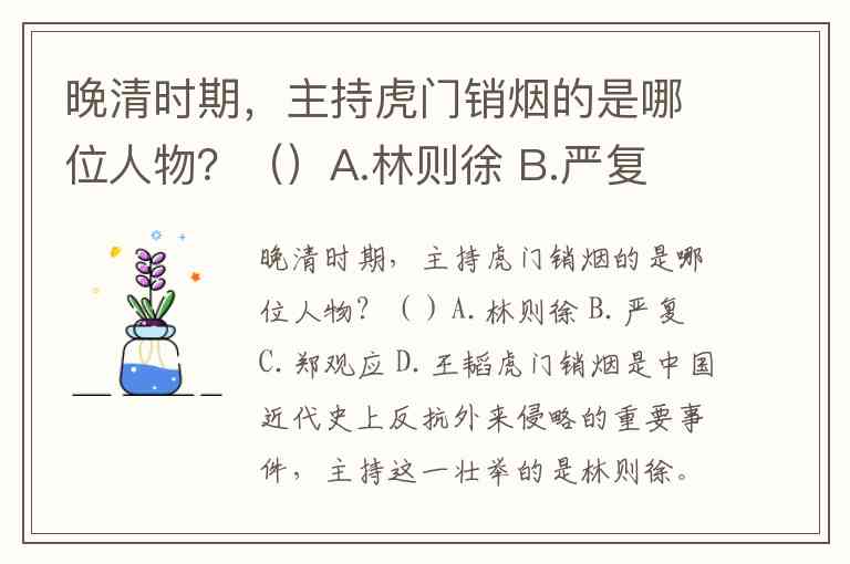 晚清时期,主持虎门销烟的是哪位人物?()A.林则徐 B.严复 C.郑观应 D.王韬