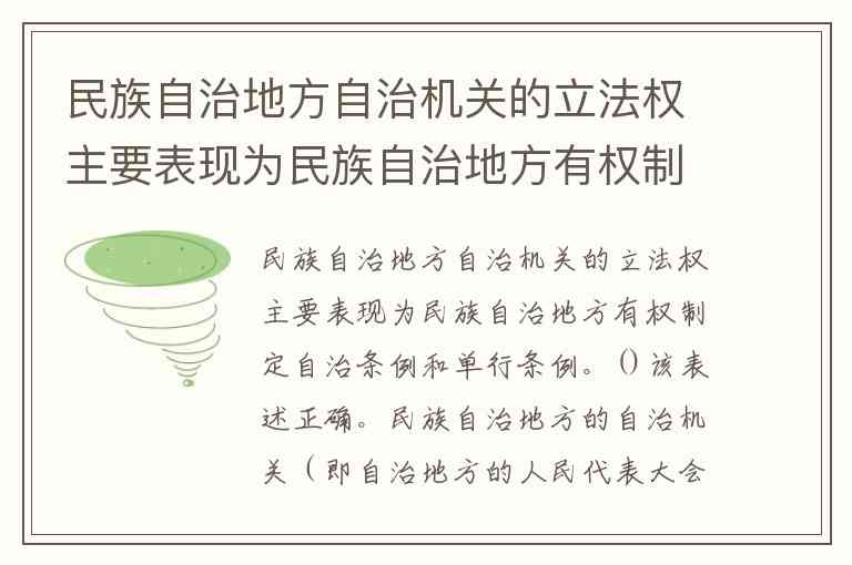 综上,“民族自治地方自治机关的立法权主要表现为民族自治地方有权制定自治条例和单行条例”这一表述准确反映了我国民族区域自治制度的法律规定和实践特征。