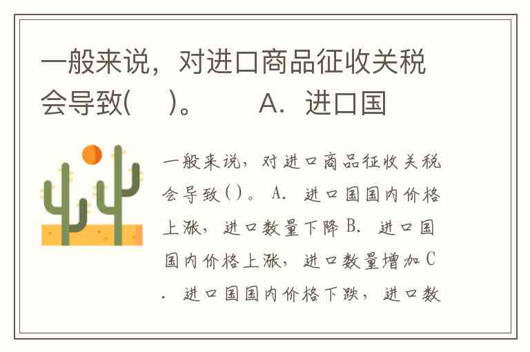 一般来说,对进口商品征收关税会导致( )。 A.进口国国内价格上涨,进口数量下降 B.进口国国内价格上涨,进口数量增加 C.进口国国内价格下跌,进口数量增加 D.进口国国内价格下跌,进口数量下降A.进口国国内价格上涨,进口数量下降 B.进口国国内价格上涨,进口数量增加 C.进口国国内价格下跌,进口数量增加