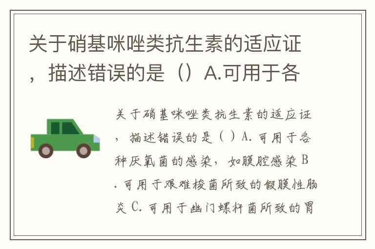 其他选项均正确:A项,该类药物是厌氧菌感染(如腹腔、盆腔感染)的首选治疗药物;B项,可用于艰难梭菌所致假膜性肠炎;C项,与其他药物联合用于幽门螺杆菌感染;D项,对加德纳菌阴道炎有效。