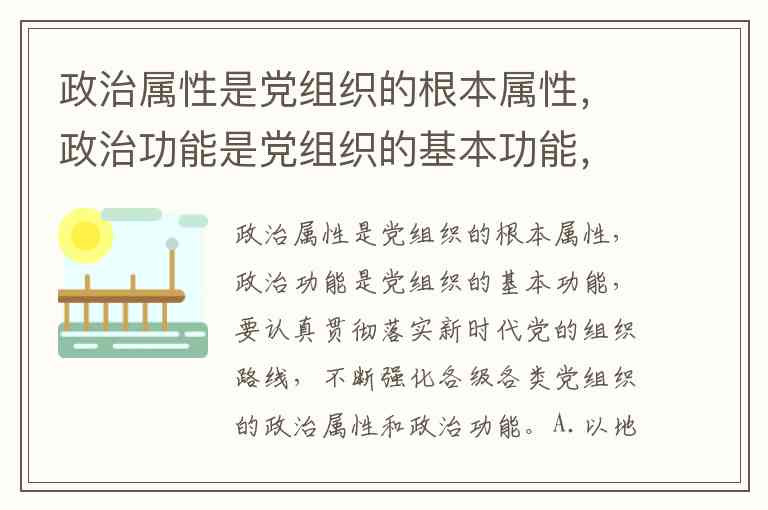您提供的选项(A.以地下储气库和沿海液化天然气(LNG)接收站为主;B.重点地区内陆集约规模化LNG储罐为辅;C.管网互联互通为支撑;D.产权清晰)与问题中关于“党组织政治属性和政治功能”的论述并无直接关联。根据参考文档,政治属性是党组织的根本属性,政治功能是其基本功能,两者相辅相成、内在统一,共同服务于党的领导和使命任务。