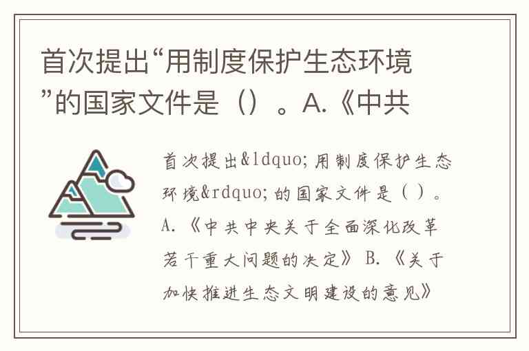 首次提出“用制度保护生态环境”的国家文件是()。A.《中共中央关于全面深化改革若干重大问题的决定》 B.《关于加快推进生态文明建设的意见》 C.《中共中央国务院关于加快林业发展的决定》 D.《中国共产党章程(修正案)》