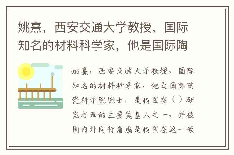 姚熹,西安交通大学教授,国际知名的材料科学家,他是国际陶瓷科学院院士,是我国在()研究方面的主要奠基人之一,并被国内外同行看成是我国在这一领域的学术带头人和代表。A.陶瓷 B.铁电陶瓷 C.电子瓷器 D.电子器件