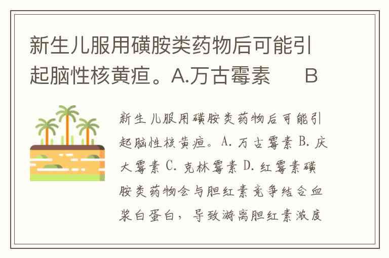 新生儿服用磺胺类药物后可能引起脑性核黄疸。A.万古霉素 B.庆大霉素 C.克林霉素 D.红霉素