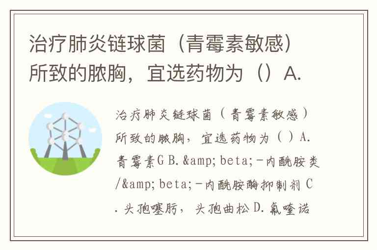 治疗肺炎链球菌(青霉素敏感)所致的脓胸,宜选药物为()A.青霉素G B.β-内酰胺类/β-内酰胺酶抑制剂 C.头孢噻肟,头孢曲松 D.氟喹诺酮类 E.糖肽类±磷霉素