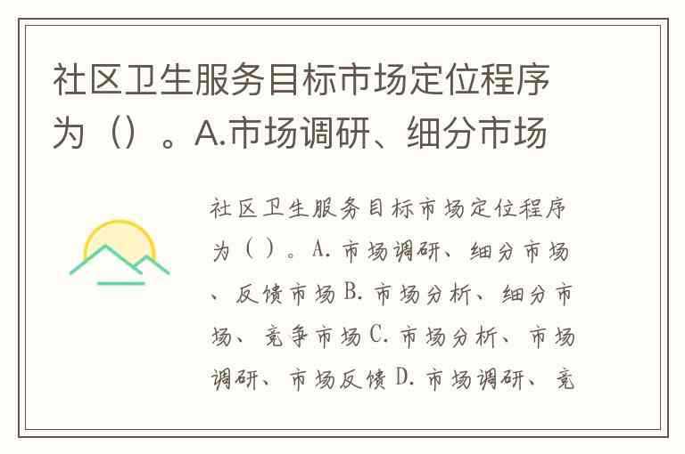 社区卫生服务目标市场定位程序为()。A.市场调研、细分市场、反馈市场 B.市场分析、细分市场、竞争市场 C.市场分析、市场调研、市场反馈 D.市场调研、竞争分析、市场反馈 E.细分市场、市场分析、竞争市场
