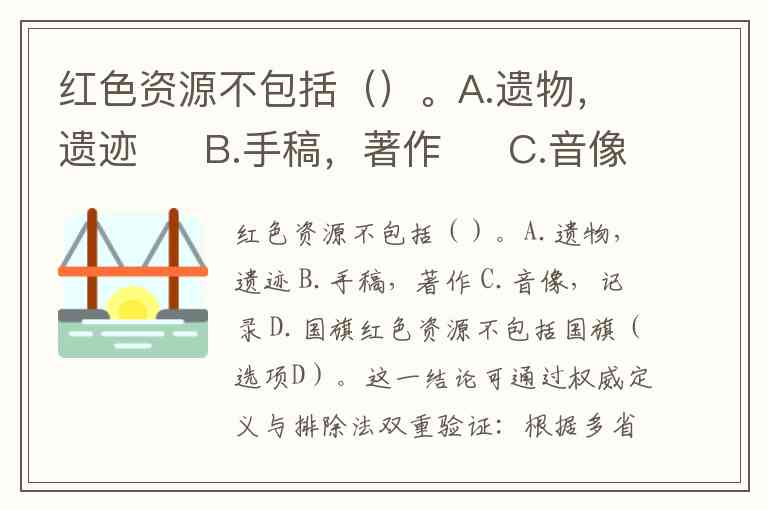 红色资源不包括国旗(选项D)。这一结论可通过权威定义与排除法双重验证:根据多省份法规和官方文件,红色资源特指中国共产党领导革命与建设历程中形成的物质与精神遗产,其核心特征是与特定历史事件、人物或精神直接关联。