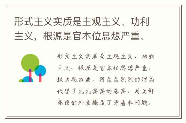 习近平总书记深刻指出,形式主义实质是主观主义、功利主义,根源是政绩观错位、责任心缺失,用轰轰烈烈的形式代替了扎扎实实的落实,用光鲜亮丽的外表掩盖了矛盾和问题。这一重要论断精准揭示了形式主义的本质与危害,为我们坚决纠治这一顽瘴痼疾提供了根本遵循。