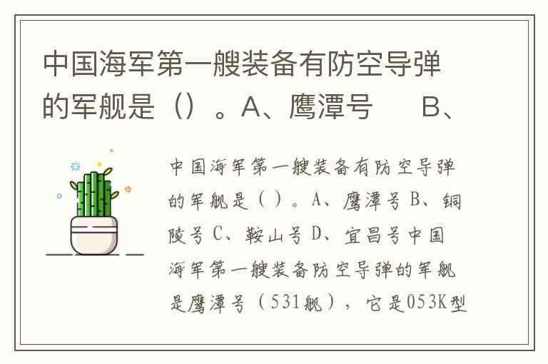 中国海军第一艘装备有防空导弹的军舰是()。A、鹰潭号 B、铜陵号 C、鞍山号 D、宜昌号
