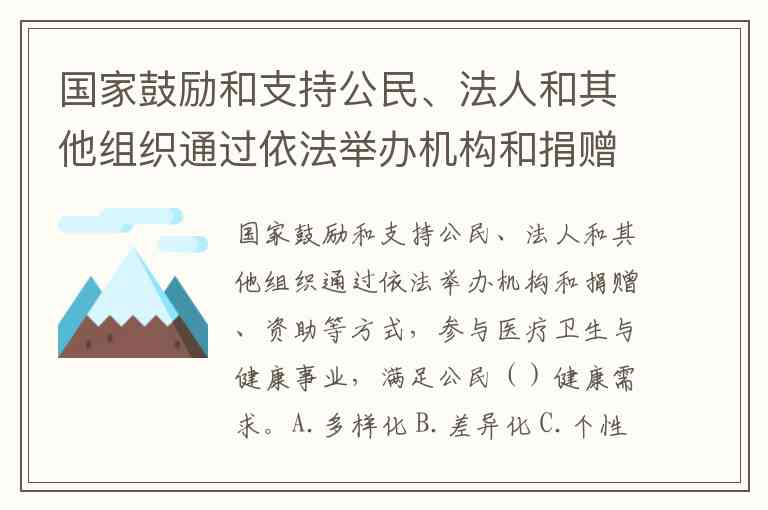 国家鼓励和支持公民、法人和其他组织通过依法举办机构和捐赠、资助等方式,参与医疗卫生与健康事业,满足公民()健康需求。A.多样化 B.差异化 C.个性化 D.单体化