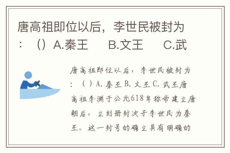 唐高祖即位以后,李世民被封为:()A.秦王 B.文王 C.武王