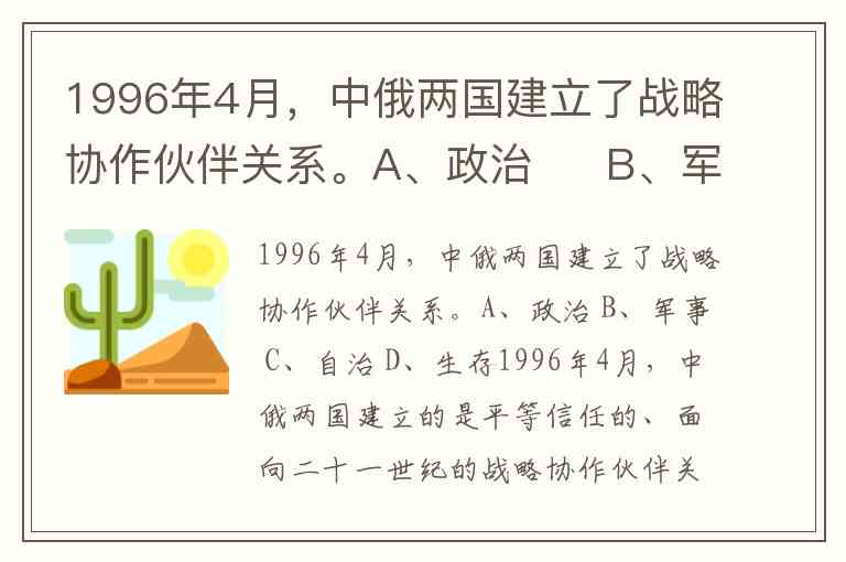 1996年4月,中俄两国建立了战略协作伙伴关系。A、政治 B、军事 C、自治 D、生存