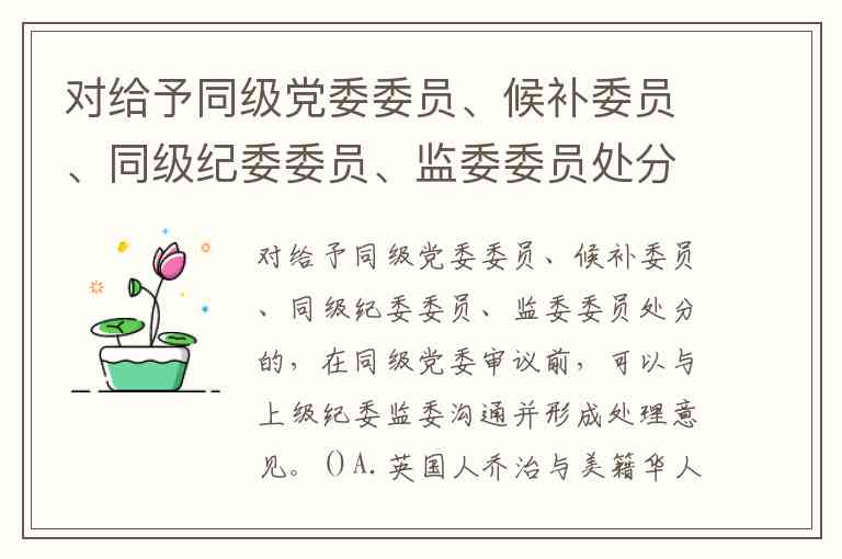 对给予同级党委委员、候补委员、同级纪委委员、监委委员处分的,在同级党委审议前,可以与上级纪委监委沟通并形成处理意见。()A.英国人乔治与美籍华人李林在杭州参与投资设立互联网公司 B.美国人史蒂夫取得上海某公司 B.巴基斯坦人阿土伯在深圳设立“大富翁”有限公司 D.法国人罗密欧与中国人朱丽叶共同在广州设立“我心依旧”商贸公司