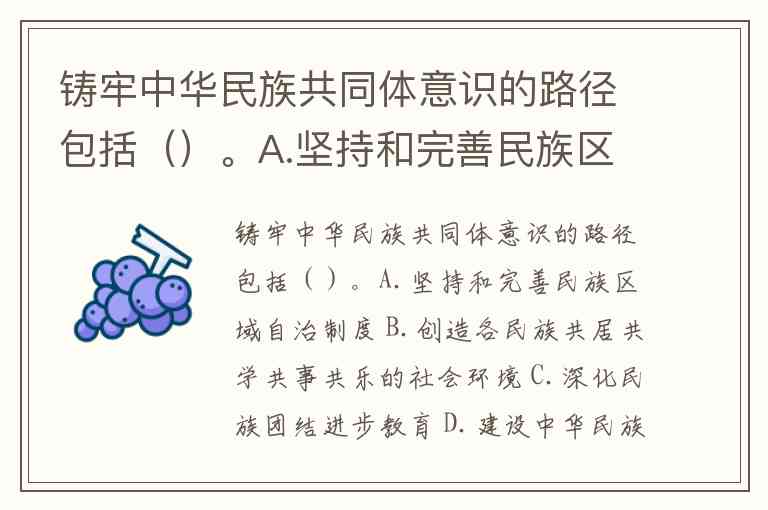 铸牢中华民族共同体意识的路径包括()。A.坚持和完善民族区域自治制度 B.创造各民族共居共学共事共乐的社会环境 C.深化民族团结进步教育 D.建设中华民族共有精神家园