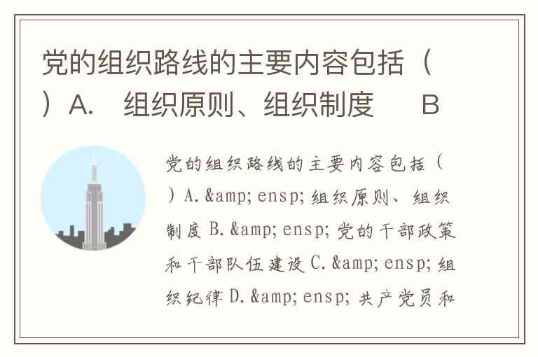 党的组织路线的主要内容包括()A. 组织原则、组织制度 B. 党的干部政策和干部队伍建设 C. 组织纪律 D. 共产党员和干部的标准党内政治生活准则