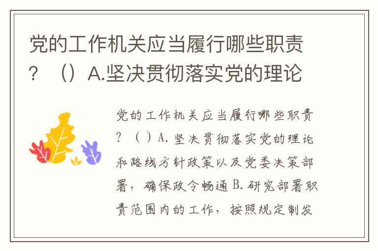 党的工作机关作为党实施领导、加强建设、推进事业的执行机关,其职责在《中国共产党工作机关条例(试行)》中有明确规范,涵盖政策执行、决策辅助、自身建设等核心领域。根据条例第十一条及相关规定,题目选项A、B、C、D、E均为正确答案,具体对应以下法定职责: