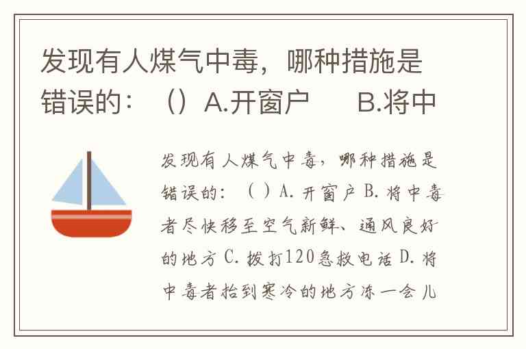 发现有人煤气中毒,哪种措施是错误的:()A.开窗户 B.将中毒者尽快移至空气新鲜、通风良好的地方 C.拨打120急救电话 D.将中毒者抬到寒冷的地方冻一会儿并灌醋