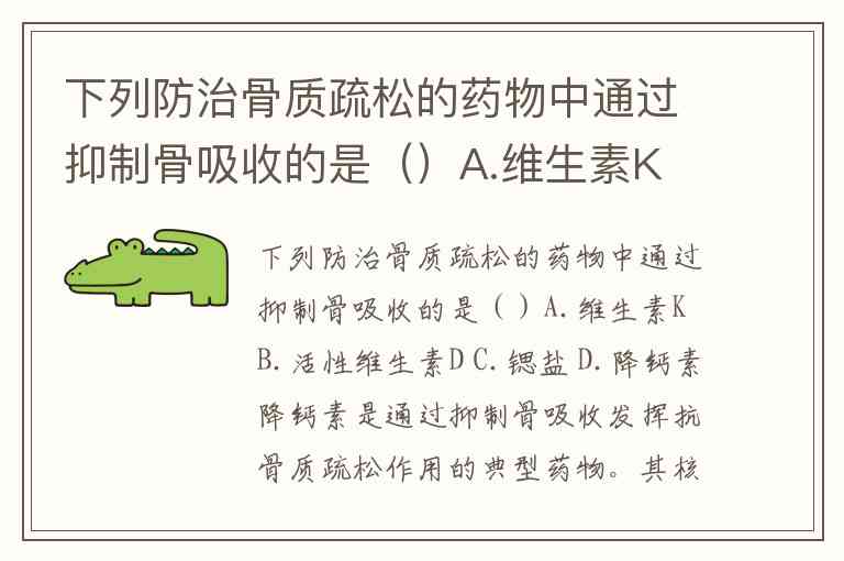 下列防治骨质疏松的药物中通过抑制骨吸收的是()A.维生素K B.活性维生素D C.锶盐 D.降钙素