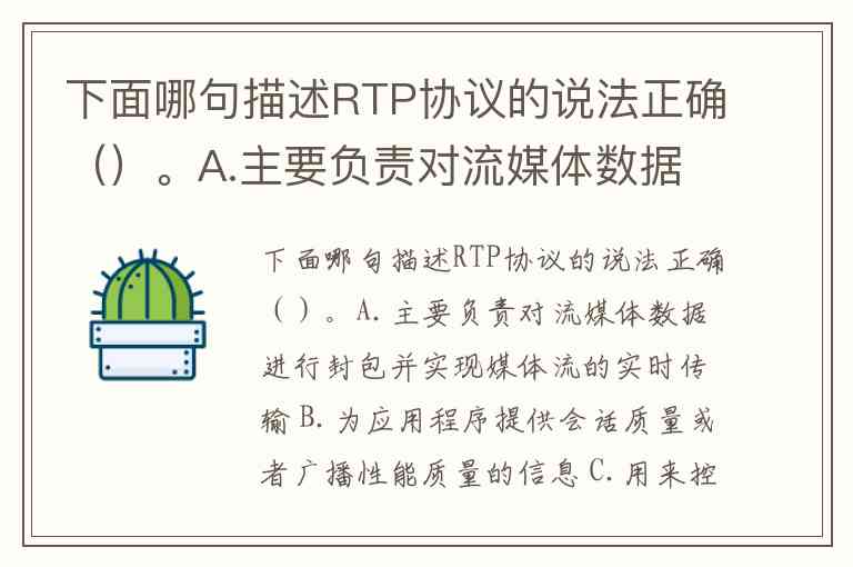 下面哪句描述RTP协议的说法正确()。A.主要负责对流媒体数据进行封包并实现媒体流的实时传输 B.为应用程序提供会话质量或者广播性能质量的信息 C.用来控制具有实时特性的数据发送 D.属于应用层协议