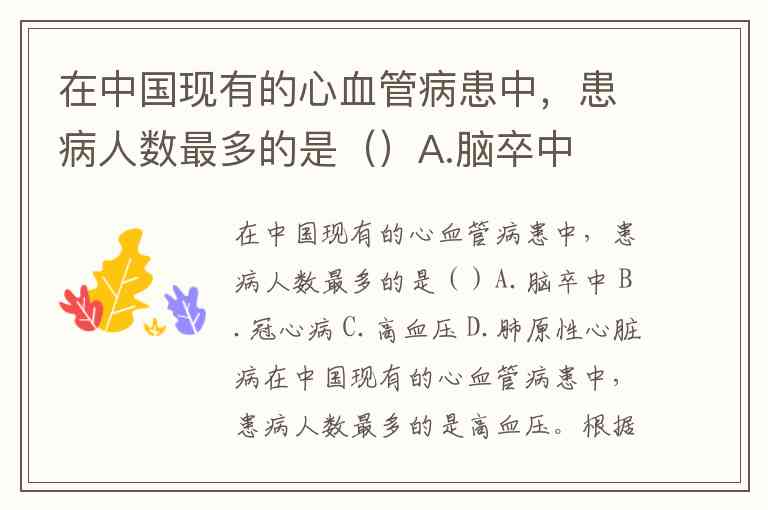 在中国现有的心血管病患中,患病人数最多的是()A.脑卒中 B.冠心病 C.高血压 D.肺原性心脏病
