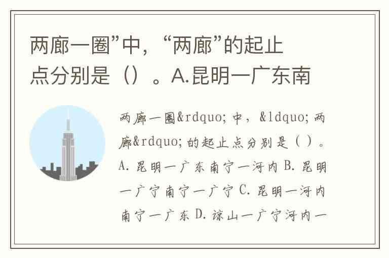 两廊一圈”中,“两廊”的起止点分别是()。A.昆明一广东南宁一河内 B.昆明一广宁南宁一广宁 C.昆明一河内南宁一广东 D.谅山一广宁河内一-南宁