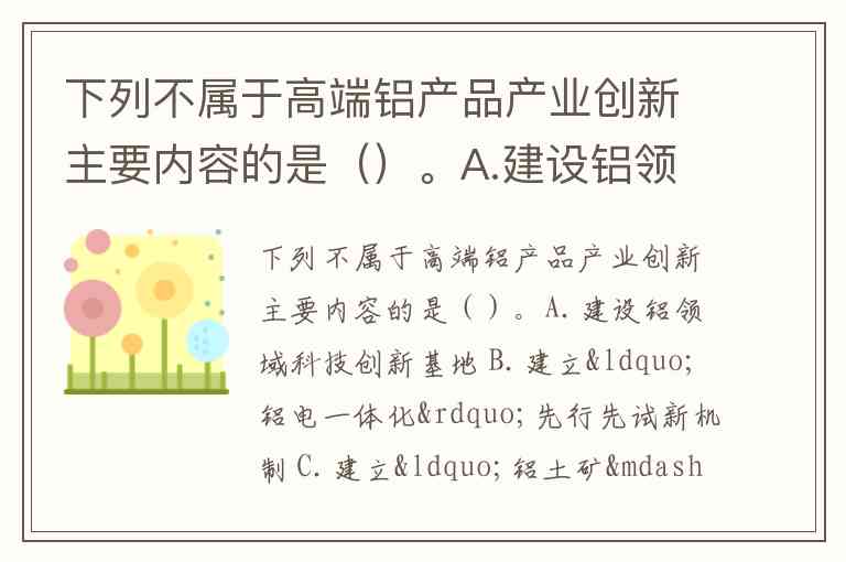 下列不属于高端铝产品产业创新主要内容的是()。A.建设铝领域科技创新基地 B.建立“铝电一体化”先行先试新机制 C.建立“铝土矿——氧化铝——点解铝——铝加工——铝精深加工”的全产业链体系 D.建立各行业铝合金材料与加工基地
