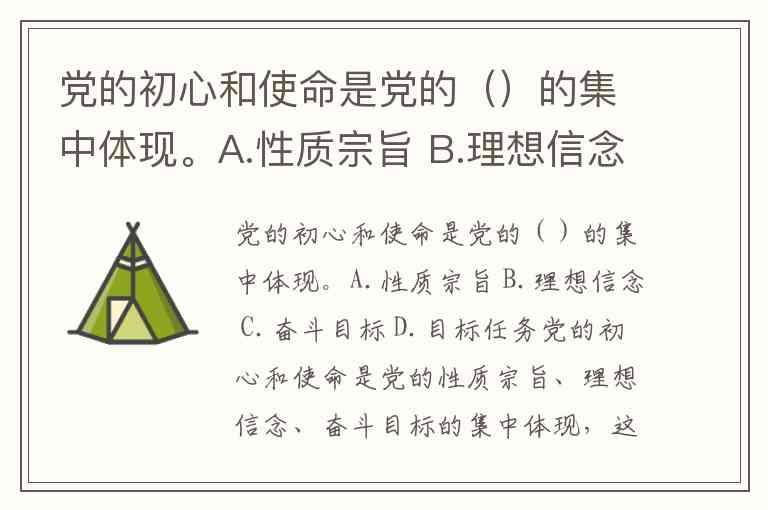 答案:党的初心和使命是党的(性质宗旨、理想信念、奋斗目标)的集中体现。