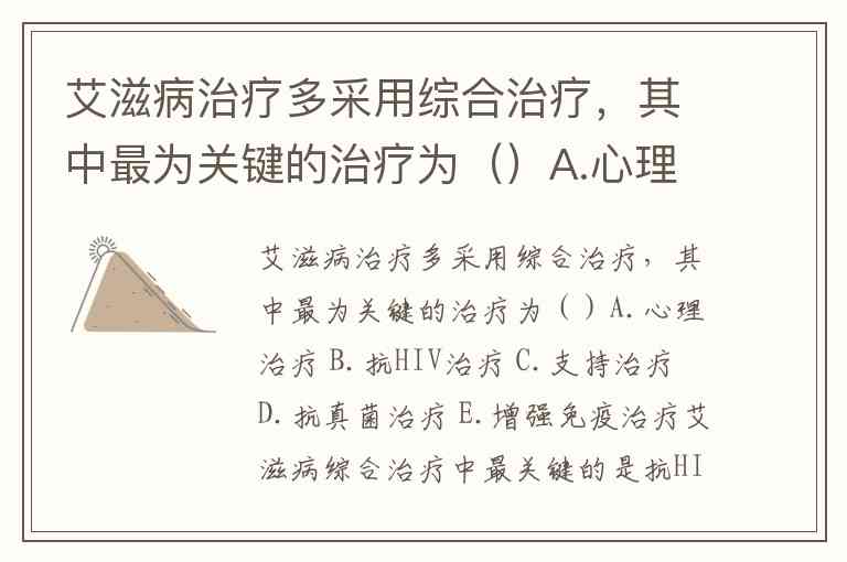 艾滋病治疗多采用综合治疗,其中最为关键的治疗为()A.心理治疗 B.抗HIV治疗 C.支持治疗 D.抗真菌治疗 E.增强免疫治疗