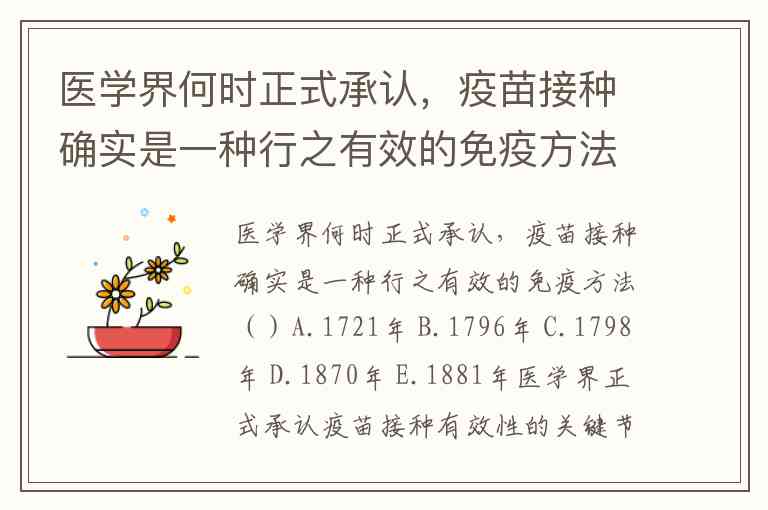 医学界何时正式承认,疫苗接种确实是一种行之有效的免疫方法()A.1721年 B.1796年 C.1798年 D.1870年 E.1881年