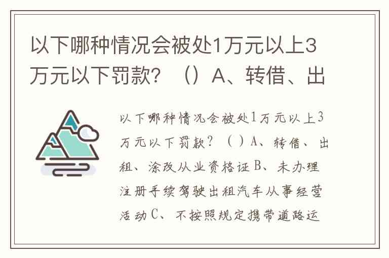 以下哪种情况会被处1万元以上3万元以下罚款?()A、转借、出租、涂改从业资格证 B、未办理注册手续驾驶出租汽车从事经营活动 C、不按照规定携带道路运输证、从业资格证 D、不按照规定使用文明用语、车容车貌不符合要求