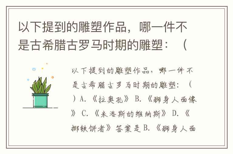 以下提到的雕塑作品,哪一件不是古希腊古罗马时期的雕塑:()A.《拉奥孔》 B.《狮身人面像》 C.《米洛斯的维纳斯》 D.《掷铁饼者》