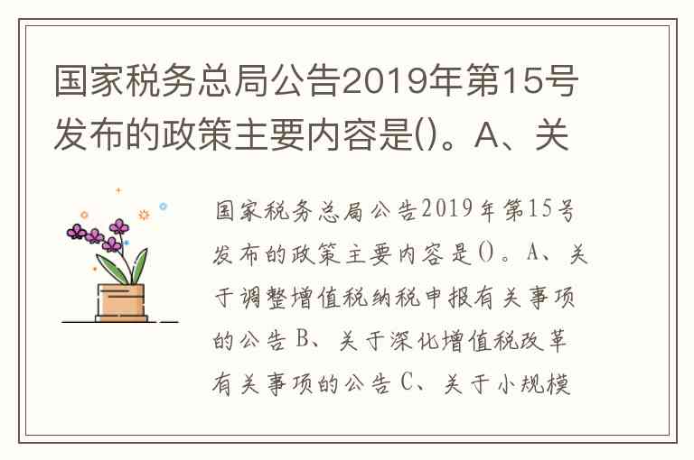 国家税务总局公告2019年第15号发布的政策主要内容是()。A、关于调整增值税纳税申报有关事项的公告 B、关于深化增值税改革有关事项的公告 C、关于小规模纳税人免征增值税政策有关征管问题 D、关于统一小规模纳税人标准等若干增值税问题的公告