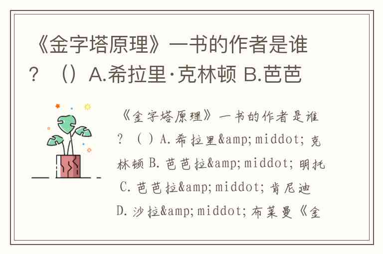 《金字塔原理》一书的作者是谁?()A.希拉里·克林顿 B.芭芭拉·明托 C.芭芭拉·肯尼迪 D.沙拉·布莱曼