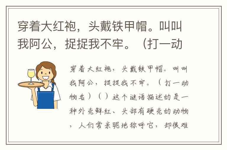 这个谜语描述的是一种外壳鲜红、头部有硬壳的动物,人们常亲昵地称呼它,却很难徒手捕捉。答案是虾。虾的外壳呈红色(大红袍),头部有坚硬的甲壳(铁甲帽),"阿公"是对它的俗称,而它身体光滑且在水中灵活难抓,完美契合谜面描述。