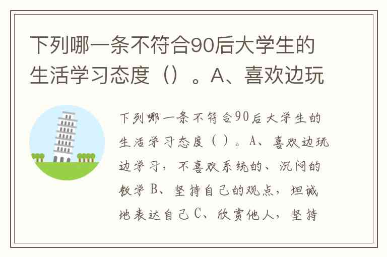下列哪一条不符合90后大学生的生活学习态度()。A、喜欢边玩边学习,不喜欢系统的、沉闷的教学 B、坚持自己的观点,坦诚地表达自己 C、欣赏他人,坚持自己 D、新知识接受性差,不深思熟虑