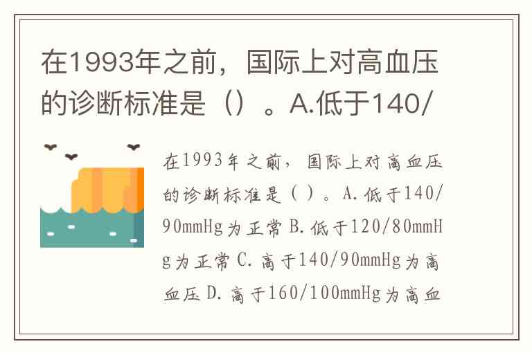 在1993年之前,国际上对高血压的诊断标准是()。A.低于140/90mmHg为正常 B.低于120/80mmHg为正常 C.高于140/90mmHg为高血压 D.高于160/100mmHg为高血压
